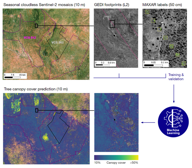 Information on tree height is derived from spaceborne LiDAR, and overlaid with very high-resolution commercial satellite data (e.g. MAXAR, 50 cm) in samples across the project landscape. Using these data, we label individual tree crowns with high spatial precision. Our machine learning models use the labels for training and quality assessment, and extrapolate to the wider landscape using the seasonal mosaics from Sentinel-2.